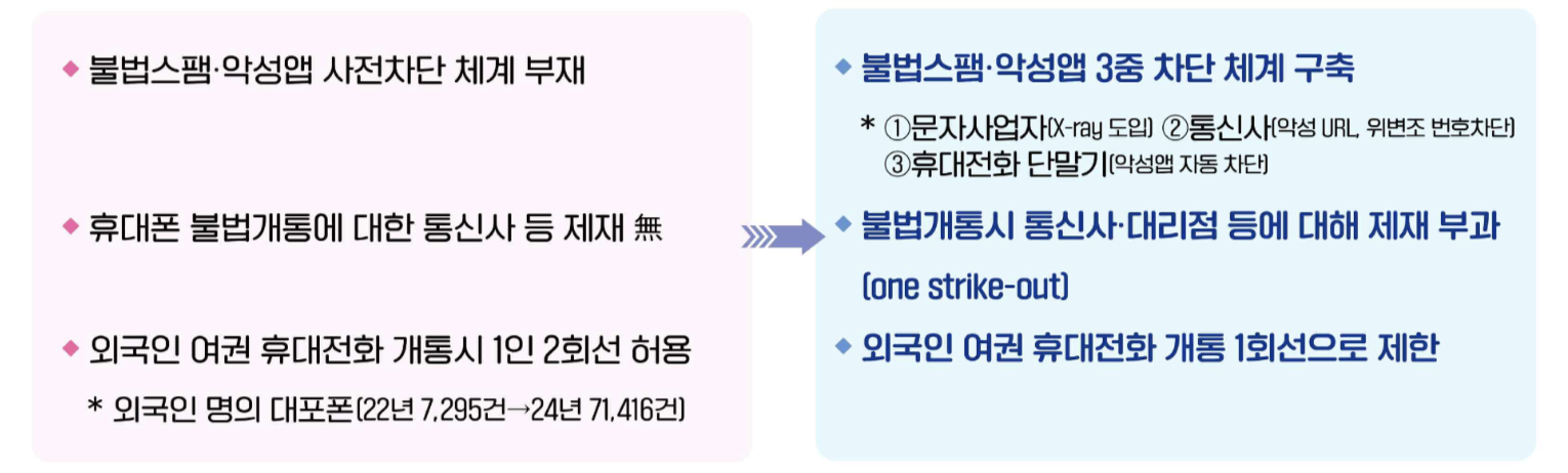 - 이통사 관리 책임 강화: 휴대폰 불법 개통에 대한 이동통신사(알뜰폰사 포함)의 관리 책임을 대폭 강화하고, 위반 시 등록 취소나 영업 정지 등 강력한 제재를 부과할 계획입니다.